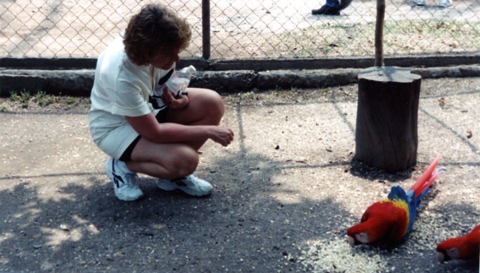Brenda with parrots at entrance at Copain (Mayan Ruins) - Honduras.
