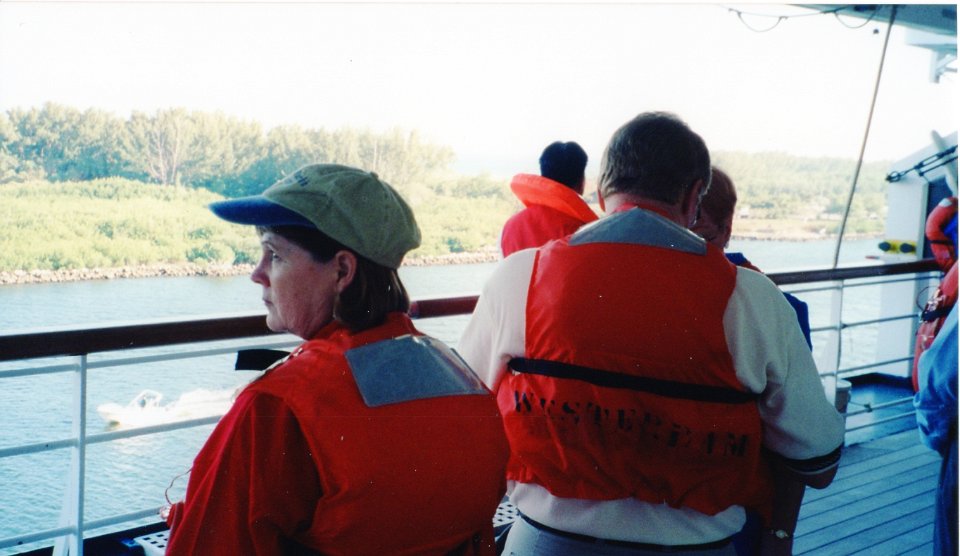 Sharon at muster call before departure from Ft. Lauderdale, Florida (muster calls no longer require flotation vests now days).