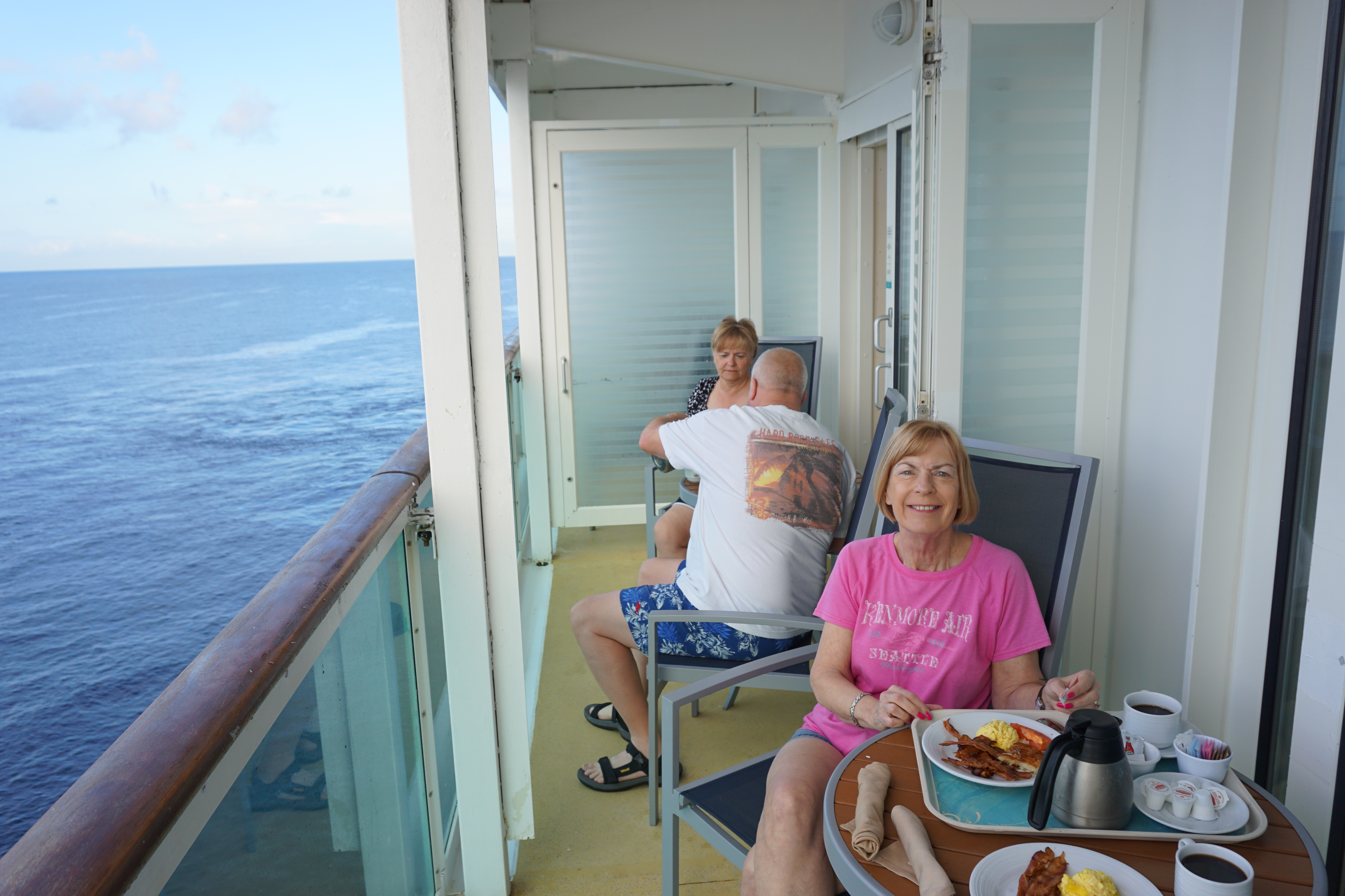 Breakfast delivered to our rooms. Eating on our adjoining balconies (Grand Cayman).