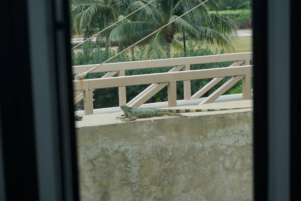 Iguana sunning itself on a bridge railing. Didn't mind cars and busses going by (Grand Cayman).