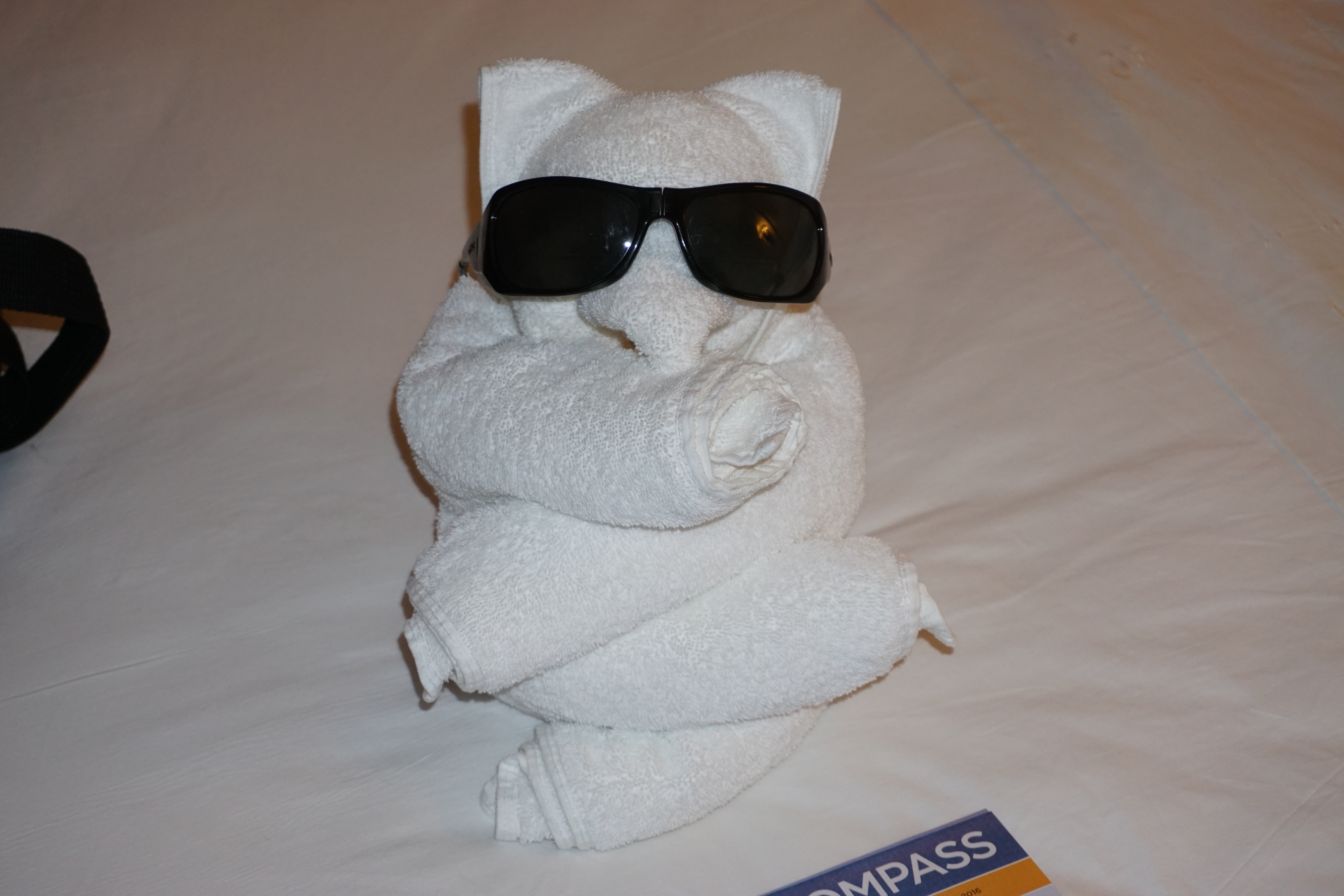 Bear made out of a towel the roomkeeper left on our bed (day at sea heading back to Florida).