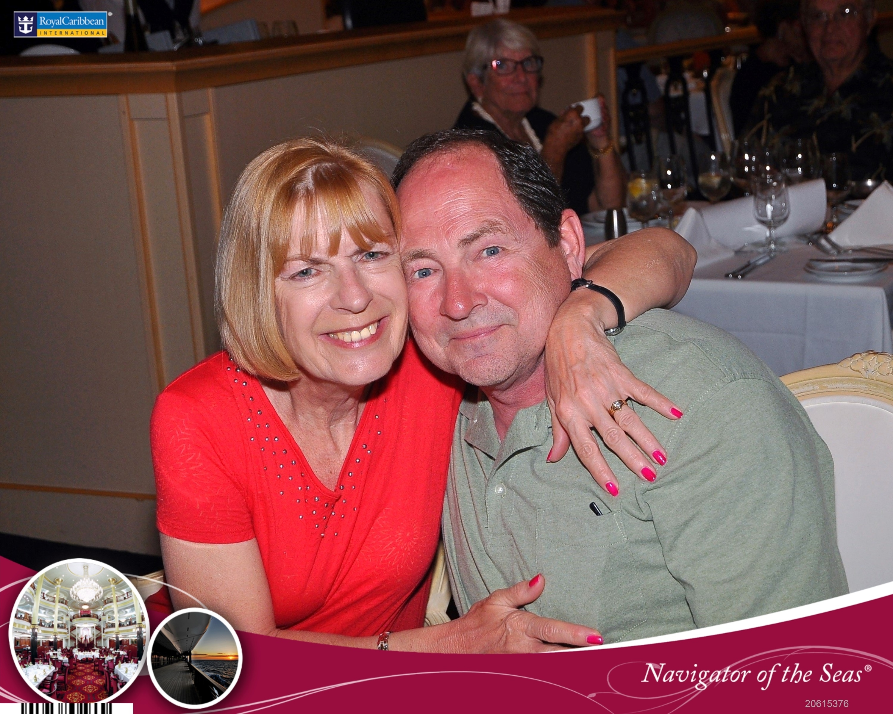 Brenda and Mark at dinner on the ship after a day in the Jamaica sun.